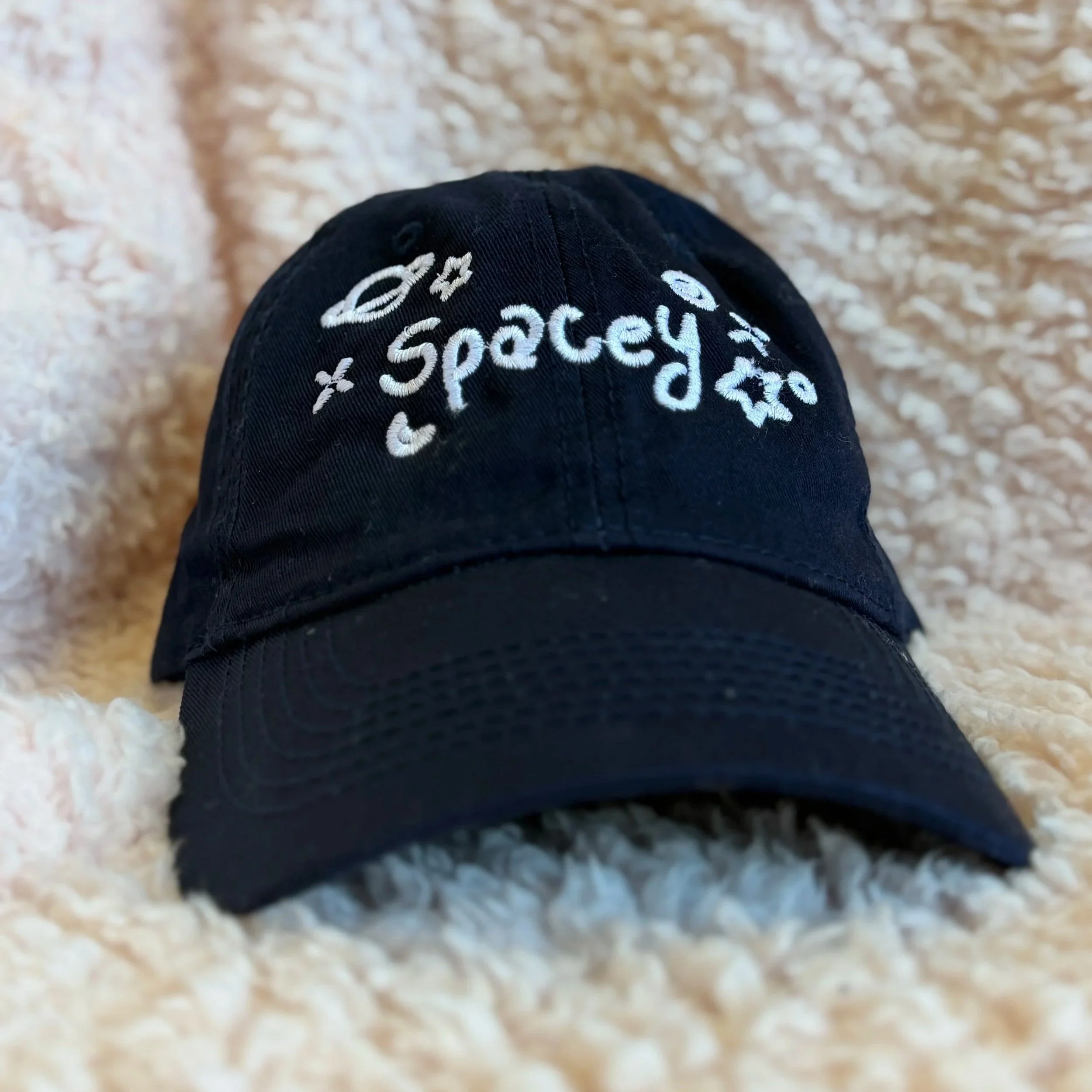 Designed by Paper Wasters Club and perfect for game days or wearing around town. Trashy is a dark red dad hat featuring an adjustable strap in the back along with an embroidered design on the front and back. Spacey is a nice dark blue with an inverted, embroidered PWC logo on the back.
